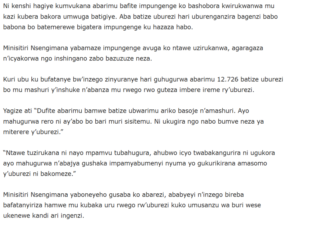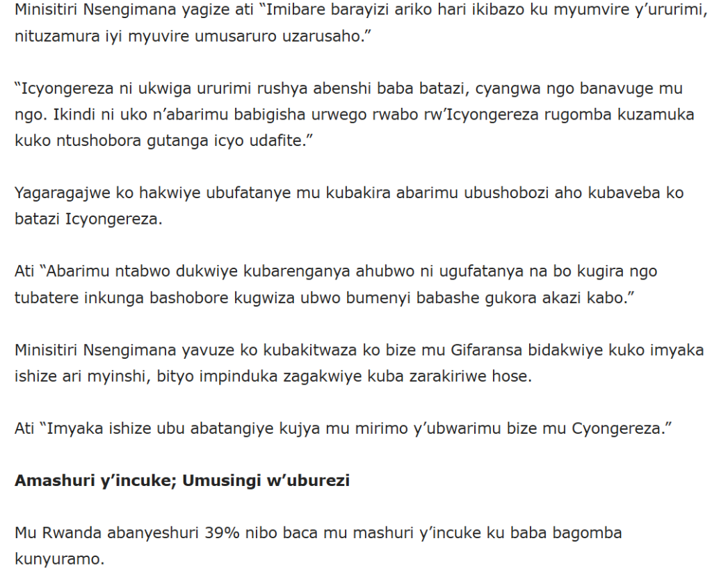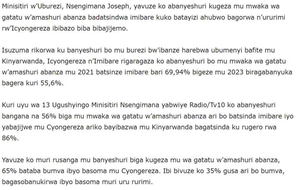 HomeEDUCATION EDUCATION ABARIMU BAFITE IMPUNGENGE ZO KWIRUKANWA ,MINISITIRI NSENGIMANA YAZIBAMAZE By CEO November 14, 2024 0 121 FacebookTwitterPinterestWhatsApp ABARIMU BAFITE IMPUNGENGE ZO KWIRUKANWA ,MINISITIRI NSENGIMANA YAZIBAMAZE Share FacebookTwitterPinterestWhatsApp Previous articleIbihugu bya Afurika byagaragaje uburyo bwo kwita ku burezi bw’ibanzeNext article Umuzamu w’ishuri arashinja Diregiteri kumwambura ibihumbi 400 CEO Related Articles Uncategorized REB Accountability measures for non-compliance with mandatory English proficiency training NESA PAST PAPERS Rwanda S1, S2 and S3 Term 2 District Past Papers Uncategorized Master the CBC: Rwanda Primary 1–6 Term 2 District Past Papers LEAVE A REPLY Cancel reply Comment: Please enter your comment! Name:* Please enter your name here Email:* You have entered an incorrect email address! Please enter your email address here Website: Save my name, email, and website in this browser for the next time I comment. Stay Connected0FansLike0FollowersFollow0SubscribersSubscribe Latest Articles Uncategorized REB Accountability measures for non-compliance with mandatory English proficiency training NESA PAST PAPERS Rwanda S1, S2 and S3 Term 2 District Past Papers Uncategorized Master the CBC: Rwanda Primary 1–6 Term 2 District Past Papers EDUCATION REB Urutonde rw’Abayobozi b’amashuri n’abayobozi bungirije bagirwa inama yo kujya mu kiruhuko cy’izabukuru. EDUCATION REB (All Districts) List of DOS, DOD and HeadTeachers reassigned to teaching positions and placed school Load more