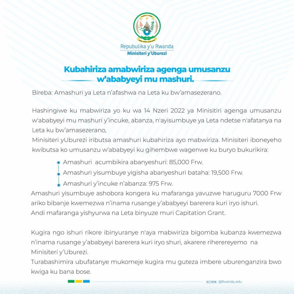 – Amashuri y’incuke n’abanza: 975 FrwMinisiteri y’Uburezi ivuga ko aya mafaranga agomba kwemezwa binyuze mu nama rusange y’ababyeyi b’abanyeshuri biga ku ishuri runaka, kandi agashyirwa mu bikorwa gusa iyo yujuje ibisabwa.