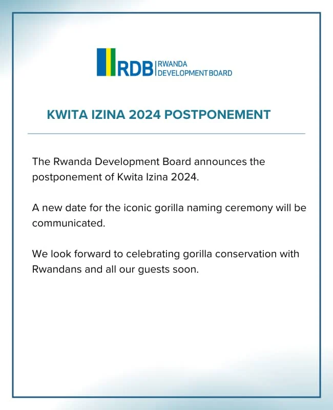 Urwego rw’Igihugu rw’Iterambere mu Rwanda, RDB, rwatangaje ko ibirori byari biteganyijwe tariki 18 Ukwakira 2024, byo Kwita Izina abana b’Ingagi, byasubitswe.