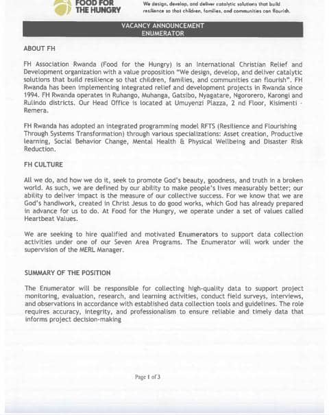 imyanya myishi yo gukora mumushinga FH Rwanda ukorera mu Rwanda kubantu bize ibintu bitandukanye