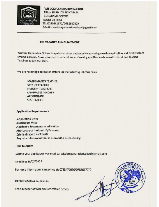 HomeUncategorized Uncategorized IMYANYA MYISHI yo kwigisa muri private school By CEO July 24, 2025 1 248 FacebookTwitterPinterestWhatsApp IMYANYA MYISHI yo kwigisa muri private school Job opportunity at E.P Saint Dominique SAVIO RushashiDownload Share FacebookTwitterPinterestWhatsApp Previous articleDr. Justin Nsengiyumva yagizwe Minisitiri w’IntebeNext articlePerezida Kagame yashyizeho Guverinoma nshya CEO Related Articles Uncategorized REB Accountability measures for non-compliance with mandatory English proficiency training NESA PAST PAPERS Rwanda S1, S2 and S3 Term 2 District Past Papers Uncategorized Master the CBC: Rwanda Primary 1–6 Term 2 District Past Papers 1 COMMENT Ni byiza Kandi turabishimye Reply LEAVE A REPLY Cancel reply Comment: Please enter your comment! Name:* Please enter your name here Email:* You have entered an incorrect email address! Please enter your email address here Website: Save my name, email, and website in this browser for the next time I comment. Stay Connected0FansLike0FollowersFollow0SubscribersSubscribe Latest Articles Uncategorized REB Accountability measures for non-compliance with mandatory English proficiency training NESA PAST PAPERS Rwanda S1, S2 and S3 Term 2 District Past Papers Uncategorized Master the CBC: Rwanda Primary 1–6 Term 2 District Past Papers EDUCATION REB Urutonde rw’Abayobozi b’amashuri n’abayobozi bungirije bagirwa inama yo kujya mu kiruhuko cy’izabukuru. EDUCATION REB (All Districts) List of DOS, DOD and HeadTeachers reassigned to teaching positions and placed school Load more