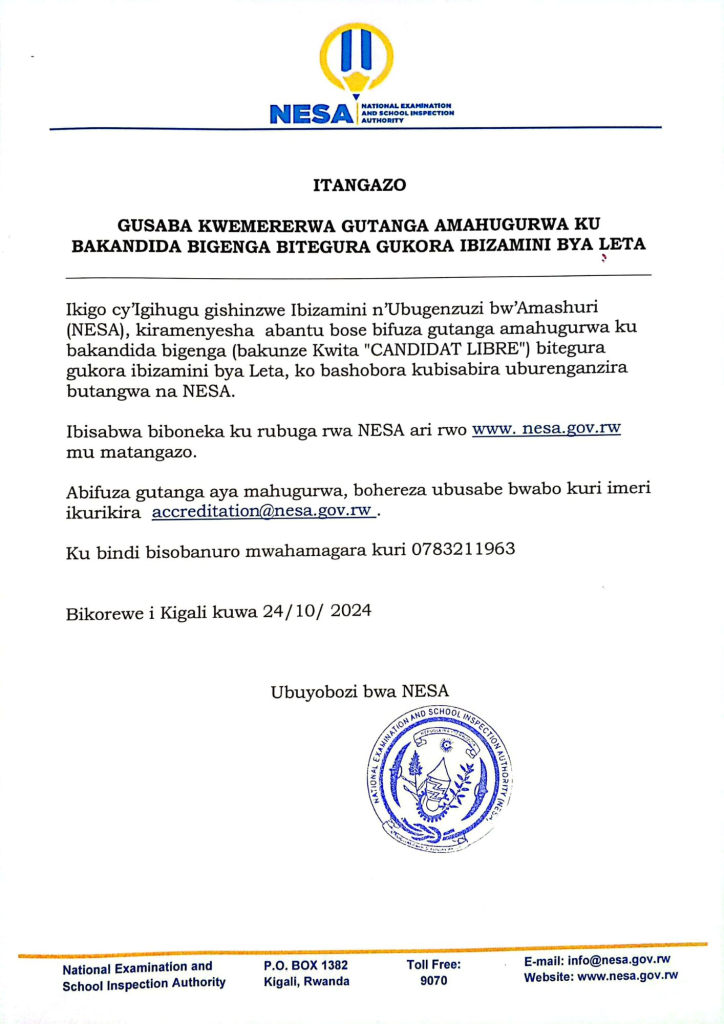 Itangazo rijyanye no gusaba kwemererwa gutanga amahugurwa ku bakandida bigenga bitegura gukora ibizamini bya leta ryo kuwa 26/10/2024