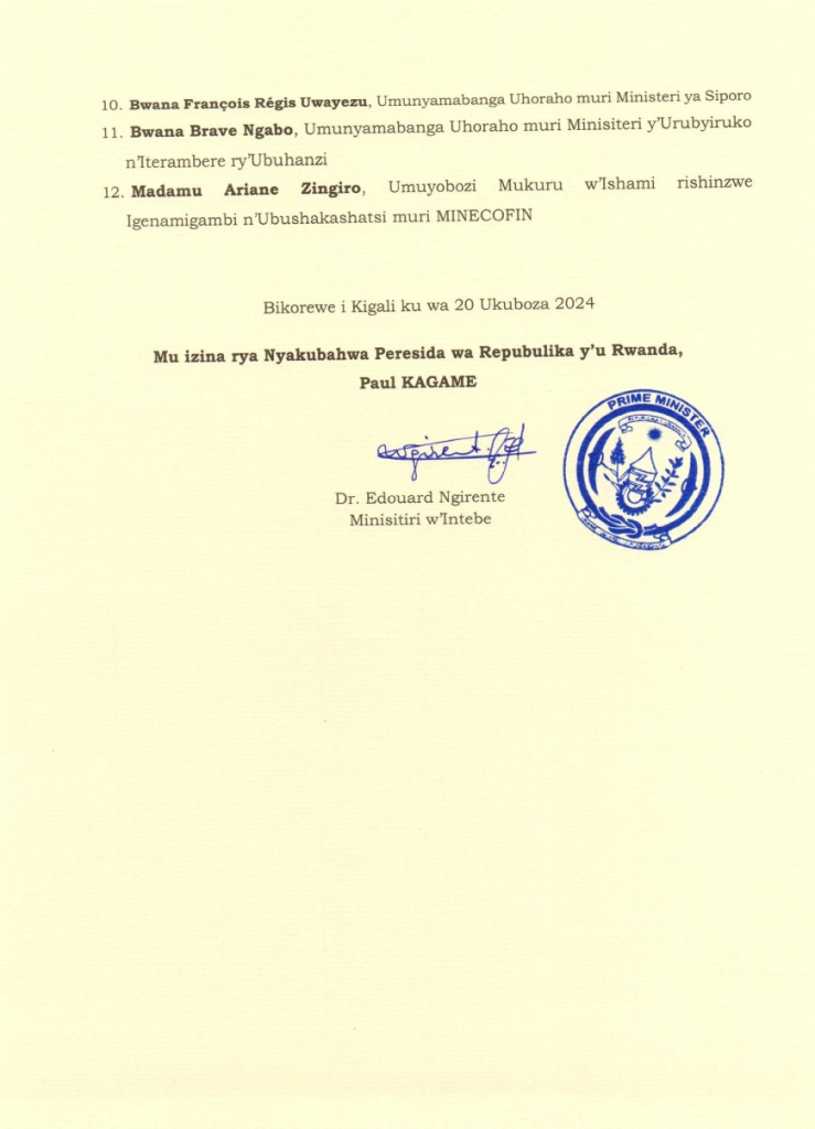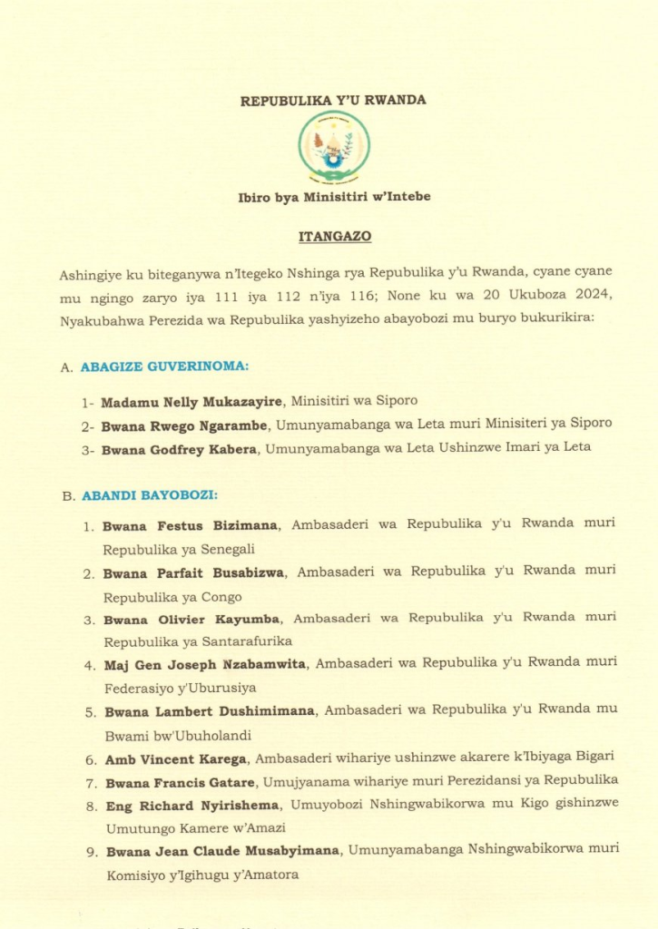 Perezida wa Repubulika yashyize mu myanya abayobozi bashya barimo Nelly Mukazayire wari Umunyamabanga uhoraho muri Minisports yagizwe Minisitiri wa Siporo maze Nyirishema Richard wari Minisitiri agirwa umuyobozi wa Rwanda Water Resources