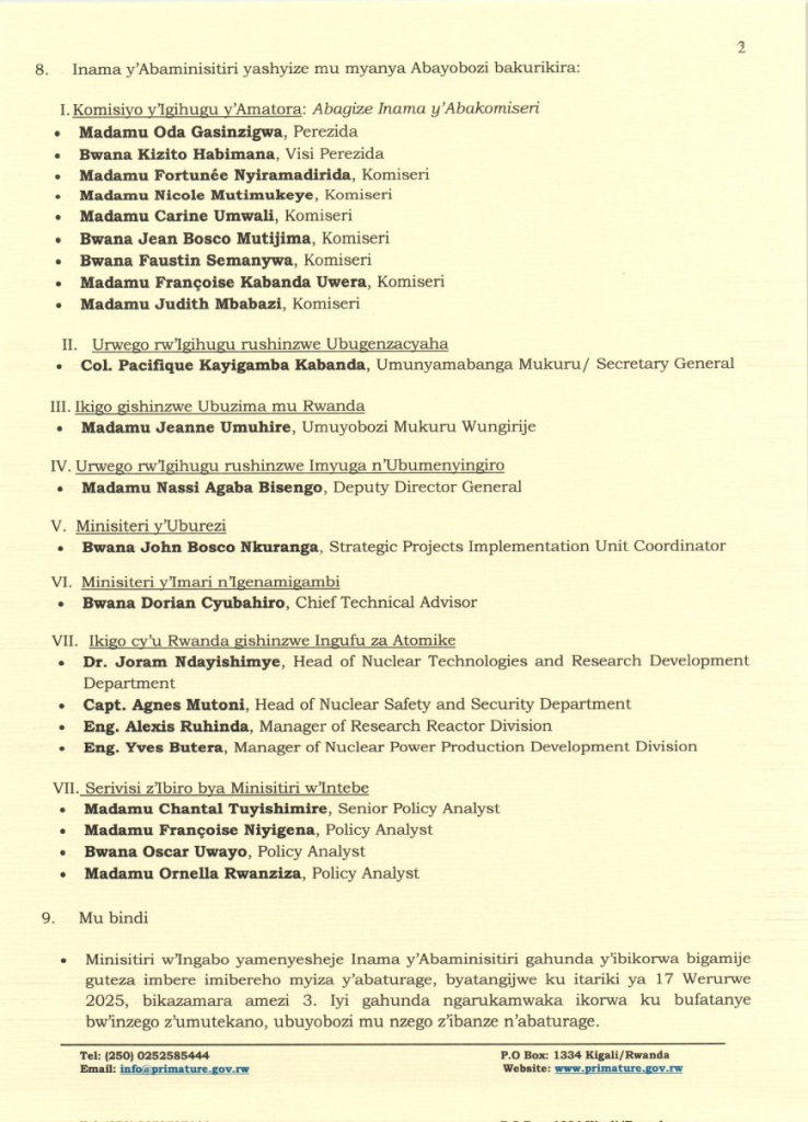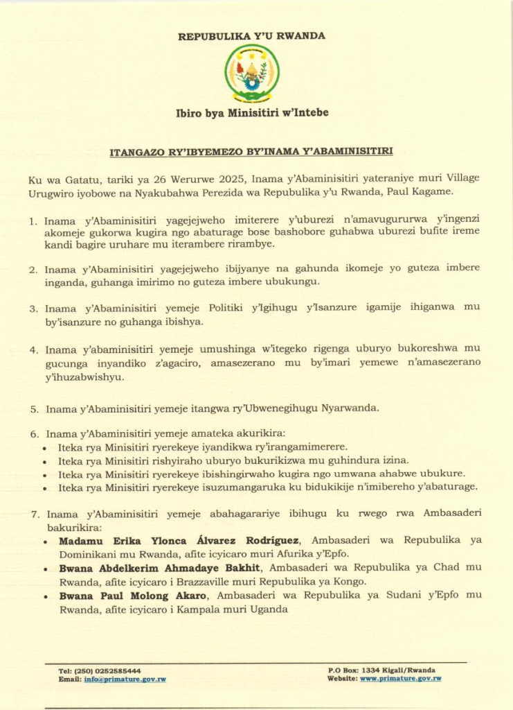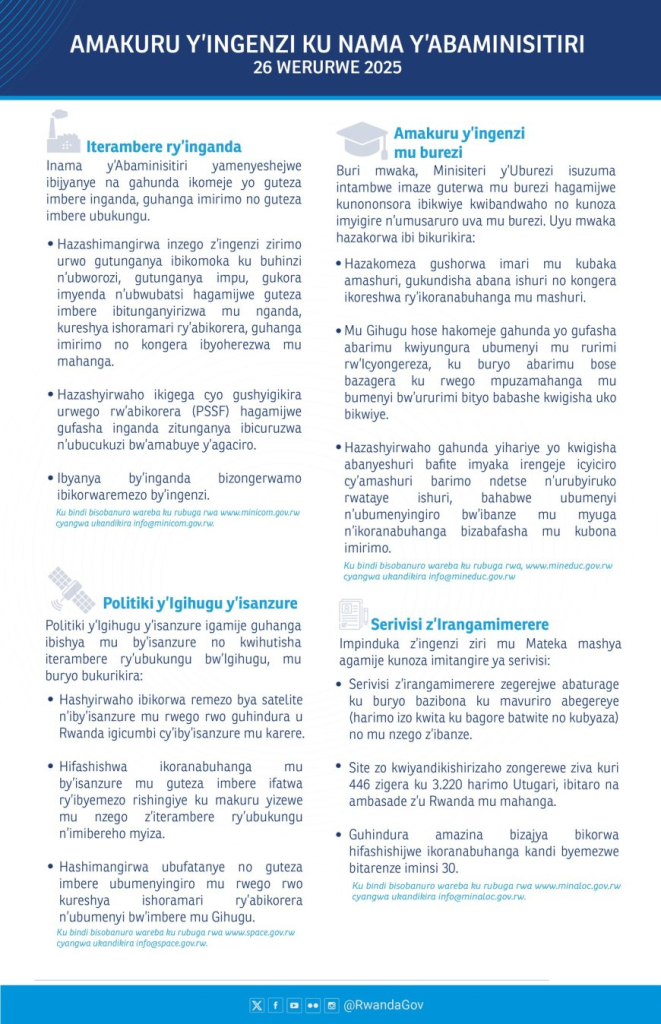 HomeRWANDAANNOUNCEMENTS ANNOUNCEMENTS Itangazo ry’Ibyemezo by’Inama y’Abaminisitiri yo ku wa 26 Werurwe 2025 By CEO March 28, 2025 0 234 FacebookTwitterPinterestWhatsApp Itangazo ry’Ibyemezo by’Inama y’Abaminisitiri yo ku wa 26 Werurwe 2025 Share FacebookTwitterPinterestWhatsApp Previous articleREB:Itangazo ryihutirwa rimenyesha ishyirwa mu myanya abarimu n,abayobazi batsinze ibizamini by, akaziNext articleUrubyiruko 20000 rugiye kwigishwa ibijyanye n’ikoranabuhanga ku buntu CEO Related Articles Uncategorized REB Accountability measures for non-compliance with mandatory English proficiency training NESA PAST PAPERS Rwanda S1, S2 and S3 Term 2 District Past Papers Uncategorized Master the CBC: Rwanda Primary 1–6 Term 2 District Past Papers LEAVE A REPLY Cancel reply Comment: Please enter your comment! Name:* Please enter your name here Email:* You have entered an incorrect email address! Please enter your email address here Website: Save my name, email, and website in this browser for the next time I comment. Stay Connected0FansLike0FollowersFollow0SubscribersSubscribe Latest Articles Uncategorized REB Accountability measures for non-compliance with mandatory English proficiency training NESA PAST PAPERS Rwanda S1, S2 and S3 Term 2 District Past Papers Uncategorized Master the CBC: Rwanda Primary 1–6 Term 2 District Past Papers EDUCATION REB Urutonde rw’Abayobozi b’amashuri n’abayobozi bungirije bagirwa inama yo kujya mu kiruhuko cy’izabukuru. EDUCATION REB (All Districts) List of DOS, DOD and HeadTeachers reassigned to teaching positions and placed school Load more