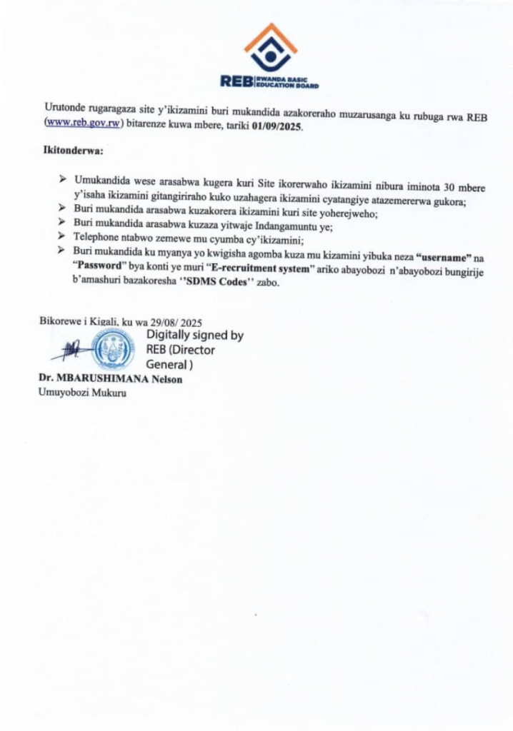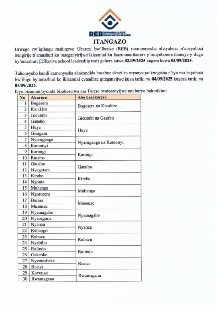 HomeUncategorized Uncategorized Itangazo ryihutirwa rigenewe Abayobozi n’abayobozi bungirije b’amashuri By CEO August 31, 2025 0 114 FacebookTwitterPinterestWhatsApp Itangazo ryihutirwa rigenewe Abayobozi n’abayobozi bungirije b’amashuri Share FacebookTwitterPinterestWhatsApp Previous articleSDMS AND NESA: S6, TVET & TTC Kureba Amanota y’Ikizamini cya Leta / Check for National Examinations RESULTS (2024/2025)Next articleUrutonde rw’abarimu basabye guhindurirwa aho bakorera (Transfers and Permutation) 2025 CEO Related Articles Uncategorized REB Accountability measures for non-compliance with mandatory English proficiency training NESA PAST PAPERS Rwanda S1, S2 and S3 Term 2 District Past Papers Uncategorized Master the CBC: Rwanda Primary 1–6 Term 2 District Past Papers LEAVE A REPLY Cancel reply Comment: Please enter your comment! Name:* Please enter your name here Email:* You have entered an incorrect email address! Please enter your email address here Website: Save my name, email, and website in this browser for the next time I comment. Stay Connected0FansLike0FollowersFollow0SubscribersSubscribe Latest Articles Uncategorized REB Accountability measures for non-compliance with mandatory English proficiency training NESA PAST PAPERS Rwanda S1, S2 and S3 Term 2 District Past Papers Uncategorized Master the CBC: Rwanda Primary 1–6 Term 2 District Past Papers EDUCATION REB Urutonde rw’Abayobozi b’amashuri n’abayobozi bungirije bagirwa inama yo kujya mu kiruhuko cy’izabukuru. EDUCATION REB (All Districts) List of DOS, DOD and HeadTeachers reassigned to teaching positions and placed school Load more