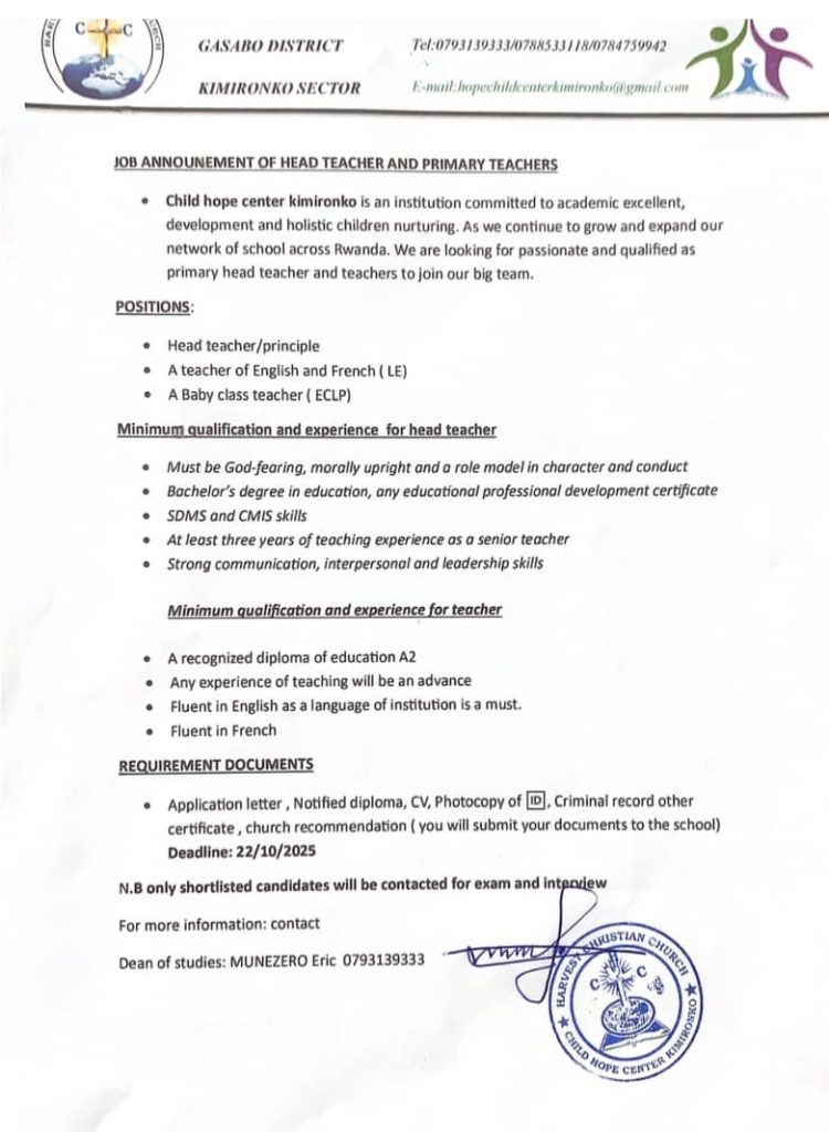 HomeUncategorized Uncategorized “JOB ANNOUNCEMENT OF HEAD TEACHER AND PRIMARY TEACHERS”. By CEO October 10, 2025 0 44 FacebookTwitterPinterestWhatsApp “JOB ANNOUNCEMENT OF HEAD TEACHER AND PRIMARY TEACHERS”. Share FacebookTwitterPinterestWhatsApp Previous articleIby’ingenzi kuri raporo u Rwanda rugiye gushyikiriza Loni ku Burenganzira bwa MuntuNext articleDore agashya mu ikorababuhanga ChatGPT yakuzaniye CEO Related Articles Uncategorized REB Accountability measures for non-compliance with mandatory English proficiency training NESA PAST PAPERS Rwanda S1, S2 and S3 Term 2 District Past Papers Uncategorized Master the CBC: Rwanda Primary 1–6 Term 2 District Past Papers LEAVE A REPLY Cancel reply Comment: Please enter your comment! Name:* Please enter your name here Email:* You have entered an incorrect email address! Please enter your email address here Website: Save my name, email, and website in this browser for the next time I comment. Stay Connected0FansLike0FollowersFollow0SubscribersSubscribe Latest Articles Uncategorized REB Accountability measures for non-compliance with mandatory English proficiency training NESA PAST PAPERS Rwanda S1, S2 and S3 Term 2 District Past Papers Uncategorized Master the CBC: Rwanda Primary 1–6 Term 2 District Past Papers EDUCATION REB Urutonde rw’Abayobozi b’amashuri n’abayobozi bungirije bagirwa inama yo kujya mu kiruhuko cy’izabukuru. EDUCATION REB (All Districts) List of DOS, DOD and HeadTeachers reassigned to teaching positions and placed school Load more