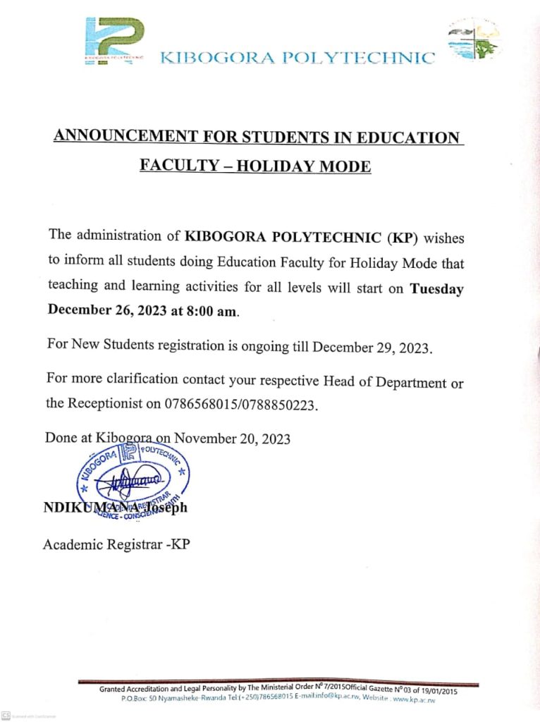 HomeRWANDAANNOUNCEMENTS ANNOUNCEMENTS KIBOGORA POLYTECHNIC ANNOUNCEMENT FOR ALL STUDENTS (CURRENT AND NEW STUDENTS). By admin November 25, 2023 0 1000 FacebookTwitterPinterestWhatsApp KIBOGORA POLYTECHNIC ANNOUNCEMENT FOR ALL STUDENTS (CURRENT AND NEW STUDENTS). Share FacebookTwitterPinterestWhatsApp Previous articleRTB ALL DISTRICTS LIST OF SCHOOLS TO BENEFIT TEACHER’S LAPTOPS.Next articleMIFOTRA Announcement to all e-recruitment portal users. adminhttps://newswithin.com Related Articles NESA PAST PAPERS Term 2 District Past Papers and Marking Guides for Senior 4, Senior 5, and Senior 6. Uncategorized REB Accountability measures for non-compliance with mandatory English proficiency training NESA PAST PAPERS Rwanda S1, S2 and S3 Term 2 District Past Papers Stay Connected0FansLike0FollowersFollow0SubscribersSubscribe Latest Articles NESA PAST PAPERS Term 2 District Past Papers and Marking Guides for Senior 4, Senior 5, and Senior 6. Uncategorized REB Accountability measures for non-compliance with mandatory English proficiency training NESA PAST PAPERS Rwanda S1, S2 and S3 Term 2 District Past Papers Uncategorized Master the CBC: Rwanda Primary 1–6 Term 2 District Past Papers EDUCATION REB Urutonde rw’Abayobozi b’amashuri n’abayobozi bungirije bagirwa inama yo kujya mu kiruhuko cy’izabukuru. Load more