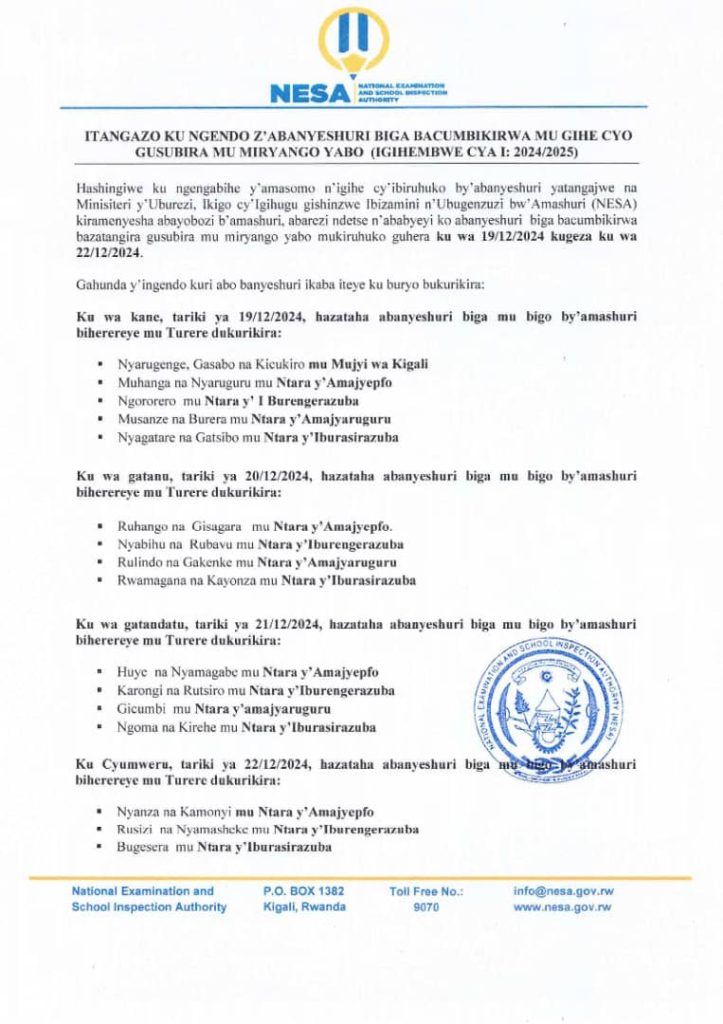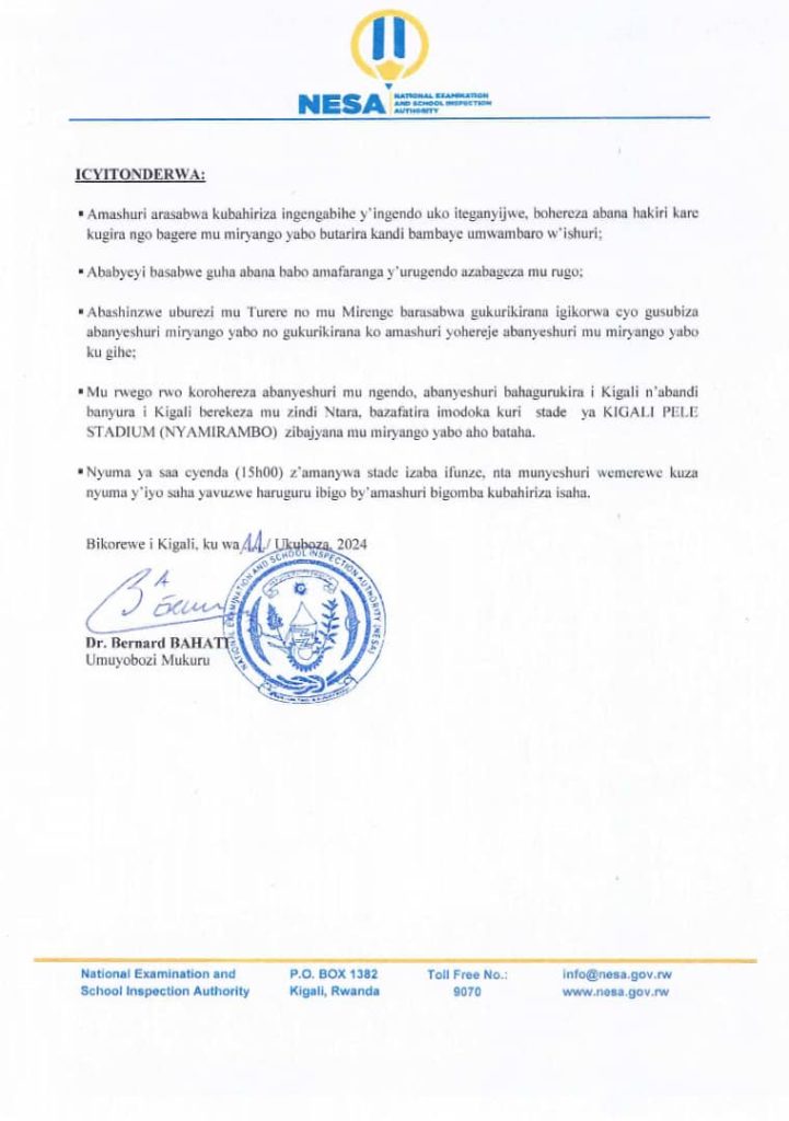 HomeEDUCATION EDUCATION NESA: itangazo ku ngendo z’abanyeshuri biga bacumbikiwe By CEO December 11, 2024 0 184 FacebookTwitterPinterestWhatsApp NESA: itangazo ku ngendo z’abanyeshuri biga bacumbikiwe Share FacebookTwitterPinterestWhatsApp Previous article27 Job Positions (Re-Advertisement) at University of Technology and Arts of Byumba(UTAB): (Deadline 20 December 2024)Next articlePSF na Polisi y’u Rwanda ku isonga mu nzego zagaragayemo ruswa mu 2024 CEO Related Articles Uncategorized REB Accountability measures for non-compliance with mandatory English proficiency training NESA PAST PAPERS Rwanda S1, S2 and S3 Term 2 District Past Papers Uncategorized Master the CBC: Rwanda Primary 1–6 Term 2 District Past Papers LEAVE A REPLY Cancel reply Comment: Please enter your comment! Name:* Please enter your name here Email:* You have entered an incorrect email address! Please enter your email address here Website: Save my name, email, and website in this browser for the next time I comment. Stay Connected0FansLike0FollowersFollow0SubscribersSubscribe Latest Articles Uncategorized REB Accountability measures for non-compliance with mandatory English proficiency training NESA PAST PAPERS Rwanda S1, S2 and S3 Term 2 District Past Papers Uncategorized Master the CBC: Rwanda Primary 1–6 Term 2 District Past Papers EDUCATION REB Urutonde rw’Abayobozi b’amashuri n’abayobozi bungirije bagirwa inama yo kujya mu kiruhuko cy’izabukuru. EDUCATION REB (All Districts) List of DOS, DOD and HeadTeachers reassigned to teaching positions and placed school Load more