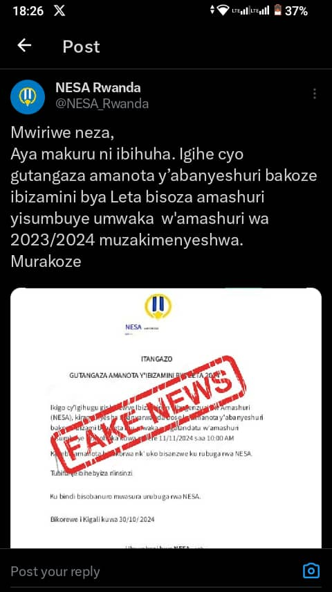 Aya makuru ni ibihuha igihe cyo gutangaza amanota y’abanyeshuri bakoze ibizamimi bya Leta bisoza amashuri yisumbuye umwaka w’amashuri 2023/2024, muzakimenyeshwa.