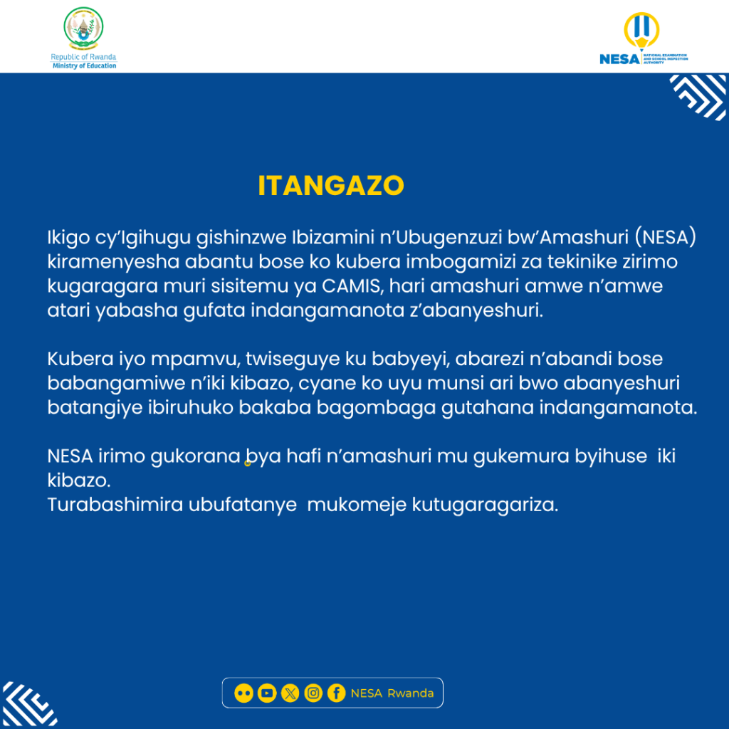 HomeUncategorized Uncategorized NESA ITANGAZO RIGENEWE ABARIMU ABANYESHURI NDETSE N’ABABYEYI (CAMIS) By CEO June 27, 2025 0 107 FacebookTwitterPinterestWhatsApp NESA ITANGAZO RIGENEWE ABARIMU ABANYESHURI NDETSE N’ABABYEYI (CAMIS) Share FacebookTwitterPinterestWhatsApp Previous articleMINEDUC/NESA ITANGAZO RIGENEWE ABARIMU,ABANYESHURI, ABAYOBIZI B’AMASHURI NDETSE N’ABATURARWANDA.Next articleBirantega mu mushinga wa Internet yashyizwe mu mashuri 1500 CEO Related Articles Uncategorized REB Accountability measures for non-compliance with mandatory English proficiency training NESA PAST PAPERS Rwanda S1, S2 and S3 Term 2 District Past Papers Uncategorized Master the CBC: Rwanda Primary 1–6 Term 2 District Past Papers LEAVE A REPLY Cancel reply Comment: Please enter your comment! Name:* Please enter your name here Email:* You have entered an incorrect email address! Please enter your email address here Website: Save my name, email, and website in this browser for the next time I comment. Stay Connected0FansLike0FollowersFollow0SubscribersSubscribe Latest Articles Uncategorized REB Accountability measures for non-compliance with mandatory English proficiency training NESA PAST PAPERS Rwanda S1, S2 and S3 Term 2 District Past Papers Uncategorized Master the CBC: Rwanda Primary 1–6 Term 2 District Past Papers EDUCATION REB Urutonde rw’Abayobozi b’amashuri n’abayobozi bungirije bagirwa inama yo kujya mu kiruhuko cy’izabukuru. EDUCATION REB (All Districts) List of DOS, DOD and HeadTeachers reassigned to teaching positions and placed school Load more