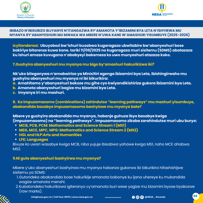 -Ko”combinations”zahindutse“learning pathways”mu mashuri yisumbuye, abakandida basabye “combinations” bashyizwe mu myanya bate? -Amanota abakandida babonye mu bizamini bya leta abarwa ate?
