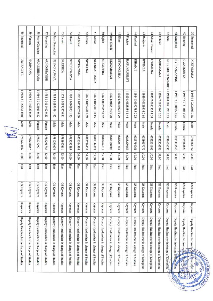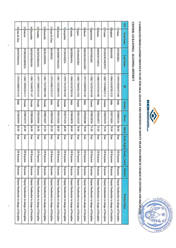 REB EASTERN PROVINCE ALL DISTRICTS LIST OF CANDIDATES TO SIT FOR EXAMS.