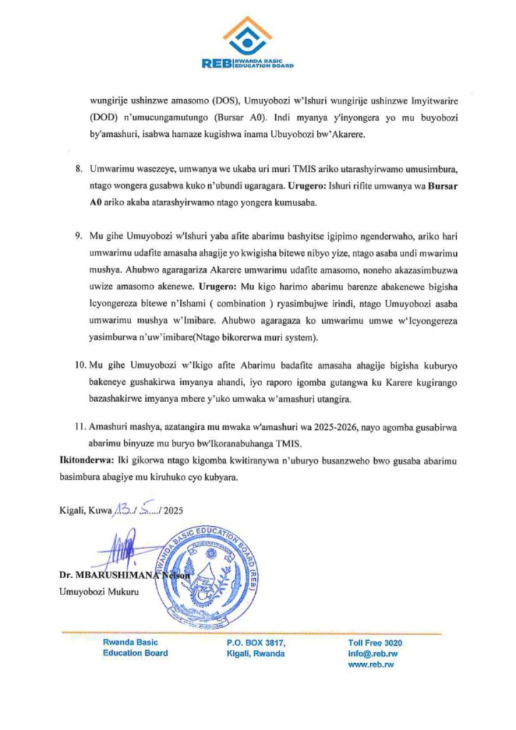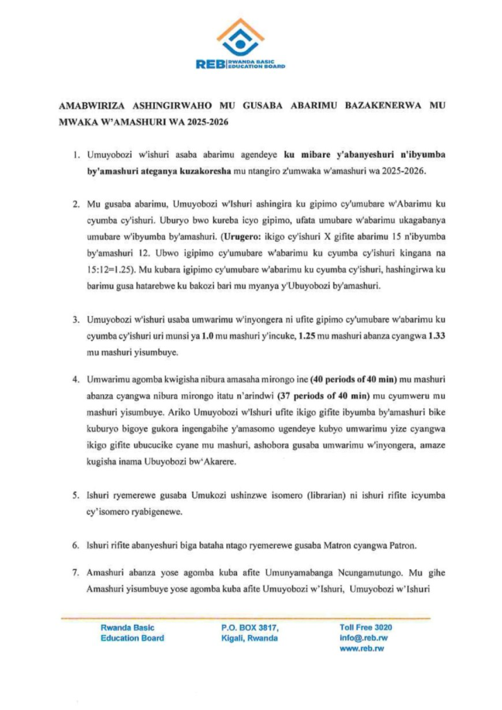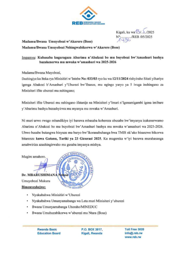 HomeUncategorized Uncategorized REB Itangazo ryihutirwa rigenewe Abarimu n’Abayobozi b’ibigo by’amashuri ku birebana n’abakozi bashya 2025-2026 By CEO May 15, 2025 0 271 FacebookTwitterPinterestWhatsApp REB Itangazo ryihutirwa rigenewe Abarimu n’Abayobozi b’ibigo by’amashuri ku birebana n’abakozi bashya 2025-2026 Share FacebookTwitterPinterestWhatsApp Previous articleAbarimu basiba akazi basabiwe guhanwa by’intangarugeroNext articleUrwego rw’Igihugu rw’Imiyoborere RGB, rwahagaritse amasengesho abera ahazwi nko kwa Yezu nyirimpuhwe muri Ruhango! CEO Related Articles Uncategorized REB Accountability measures for non-compliance with mandatory English proficiency training NESA PAST PAPERS Rwanda S1, S2 and S3 Term 2 District Past Papers Uncategorized Master the CBC: Rwanda Primary 1–6 Term 2 District Past Papers LEAVE A REPLY Cancel reply Comment: Please enter your comment! Name:* Please enter your name here Email:* You have entered an incorrect email address! Please enter your email address here Website: Save my name, email, and website in this browser for the next time I comment. Stay Connected0FansLike0FollowersFollow0SubscribersSubscribe Latest Articles Uncategorized REB Accountability measures for non-compliance with mandatory English proficiency training NESA PAST PAPERS Rwanda S1, S2 and S3 Term 2 District Past Papers Uncategorized Master the CBC: Rwanda Primary 1–6 Term 2 District Past Papers EDUCATION REB Urutonde rw’Abayobozi b’amashuri n’abayobozi bungirije bagirwa inama yo kujya mu kiruhuko cy’izabukuru. EDUCATION REB (All Districts) List of DOS, DOD and HeadTeachers reassigned to teaching positions and placed school Load more
