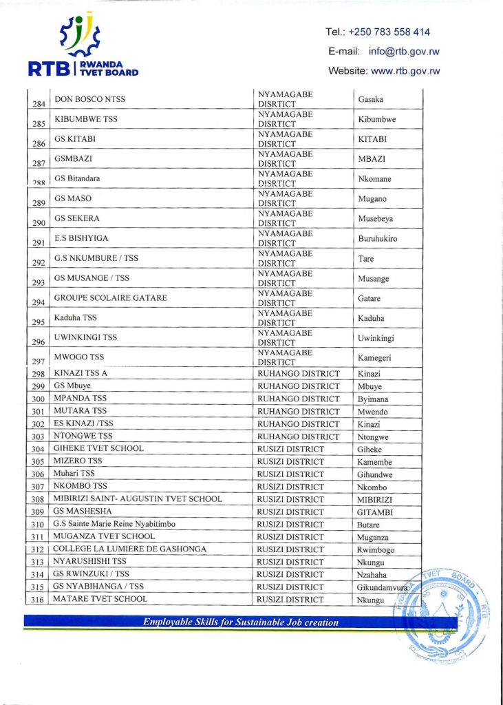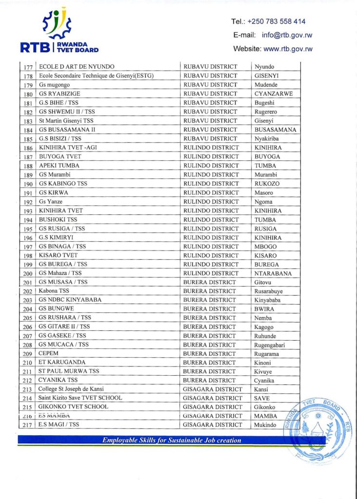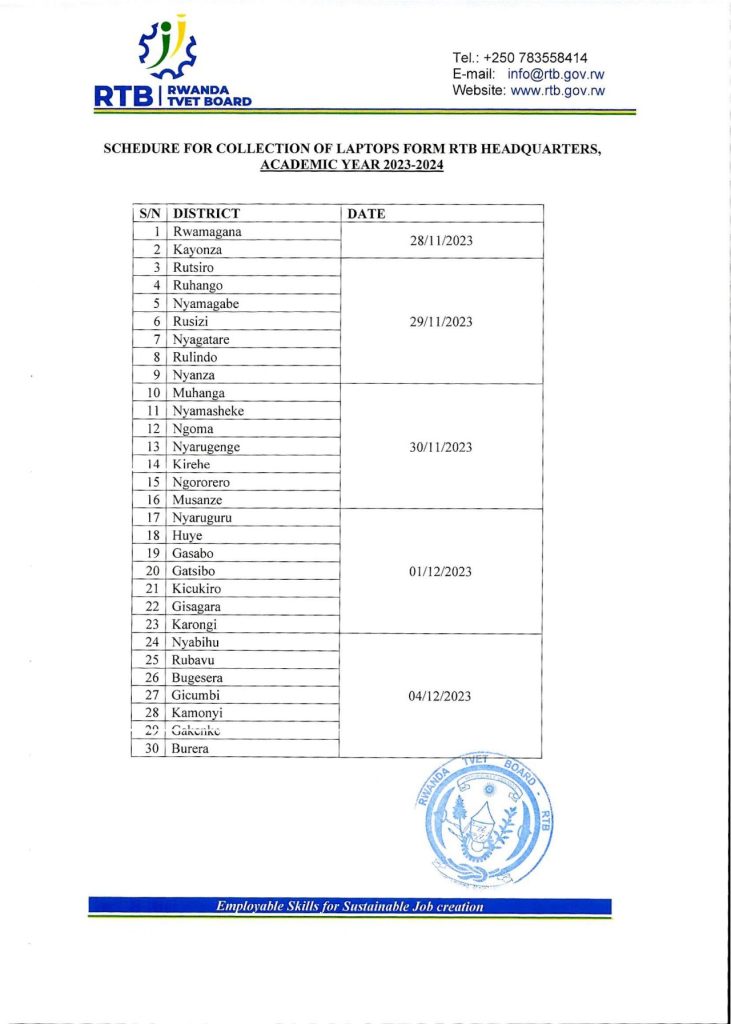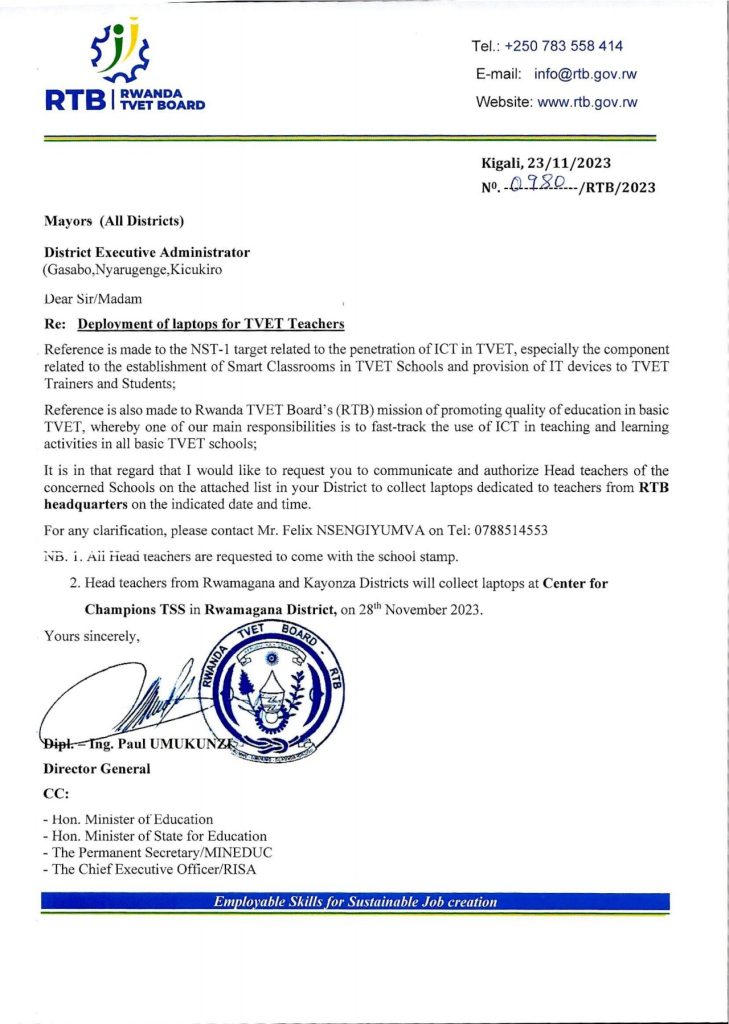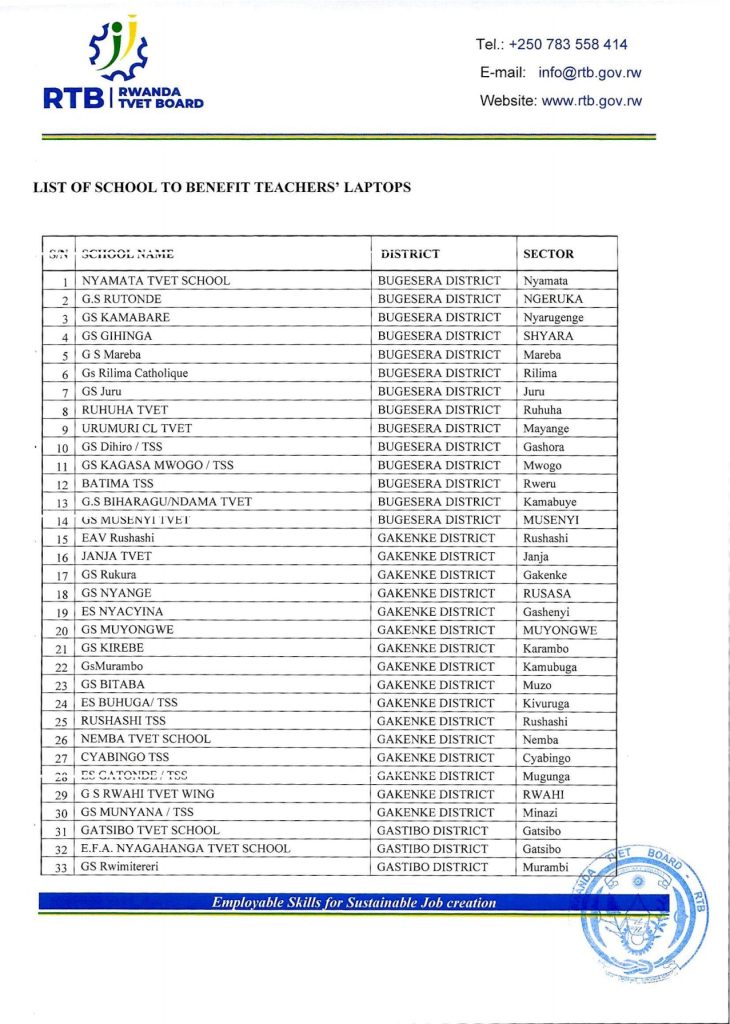 HomeRWANDAANNOUNCEMENTS ANNOUNCEMENTS RTB ALL DISTRICTS LIST OF SCHOOLS TO BENEFIT TEACHER’S LAPTOPS. By admin November 24, 2023 0 5632 FacebookTwitterPinterestWhatsApp Share FacebookTwitterPinterestWhatsApp Previous articleRTB SCHEDULE FOR COLLECTION OF TEACHER’S LAPTOPS FROM HEADQUARTER.Next articleKIBOGORA POLYTECHNIC ANNOUNCEMENT FOR ALL STUDENTS (CURRENT AND NEW STUDENTS). adminhttps://newswithin.com Related Articles NESA PAST PAPERS Term 2 District Past Papers and Marking Guides for Senior 4, Senior 5, and Senior 6. Uncategorized REB Accountability measures for non-compliance with mandatory English proficiency training NESA PAST PAPERS Rwanda S1, S2 and S3 Term 2 District Past Papers Stay Connected0FansLike0FollowersFollow0SubscribersSubscribe Latest Articles NESA PAST PAPERS Term 2 District Past Papers and Marking Guides for Senior 4, Senior 5, and Senior 6. Uncategorized REB Accountability measures for non-compliance with mandatory English proficiency training NESA PAST PAPERS Rwanda S1, S2 and S3 Term 2 District Past Papers Uncategorized Master the CBC: Rwanda Primary 1–6 Term 2 District Past Papers EDUCATION REB Urutonde rw’Abayobozi b’amashuri n’abayobozi bungirije bagirwa inama yo kujya mu kiruhuko cy’izabukuru. Load more