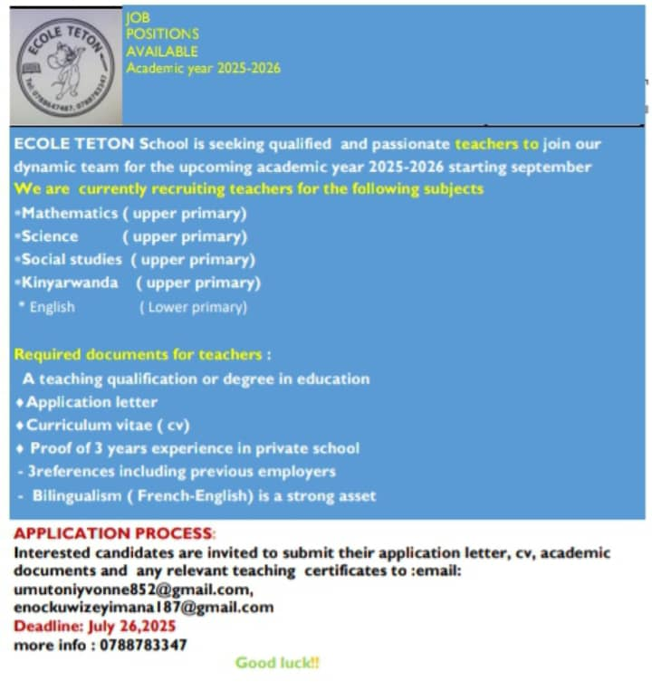 HomeUncategorized Uncategorized TEACHING JOBS: MATHS, SCIENCE, SRS, KINYARWANDA AND ENGLISH POSITIONS AT ECOLE TETON By CEO July 25, 2025 0 112 FacebookTwitterPinterestWhatsApp TEACHING JOBS: MATHS, SCIENCE, SRS, KINYARWANDA AND ENGLISH POSITIONS AT ECOLE TETON Share FacebookTwitterPinterestWhatsApp Previous articleOPPORTUNITY: CATHOLIC UNIVERSITY OF RWANDA – ISA FINANCINGNext articleMINEDUC irasabwa gukemura ibibazo biri mu Ikoranabuhanga rya Kaminuza y’u Rwanda CEO Related Articles Uncategorized REB Accountability measures for non-compliance with mandatory English proficiency training NESA PAST PAPERS Rwanda S1, S2 and S3 Term 2 District Past Papers Uncategorized Master the CBC: Rwanda Primary 1–6 Term 2 District Past Papers LEAVE A REPLY Cancel reply Comment: Please enter your comment! Name:* Please enter your name here Email:* You have entered an incorrect email address! Please enter your email address here Website: Save my name, email, and website in this browser for the next time I comment. Stay Connected0FansLike0FollowersFollow0SubscribersSubscribe Latest Articles Uncategorized REB Accountability measures for non-compliance with mandatory English proficiency training NESA PAST PAPERS Rwanda S1, S2 and S3 Term 2 District Past Papers Uncategorized Master the CBC: Rwanda Primary 1–6 Term 2 District Past Papers EDUCATION REB Urutonde rw’Abayobozi b’amashuri n’abayobozi bungirije bagirwa inama yo kujya mu kiruhuko cy’izabukuru. EDUCATION REB (All Districts) List of DOS, DOD and HeadTeachers reassigned to teaching positions and placed school Load more