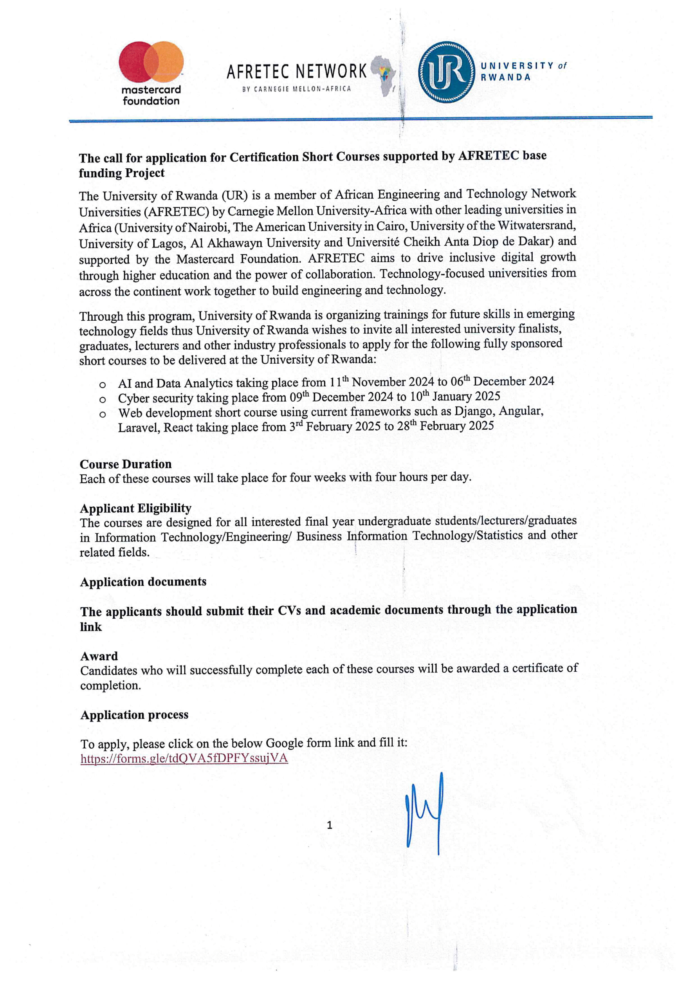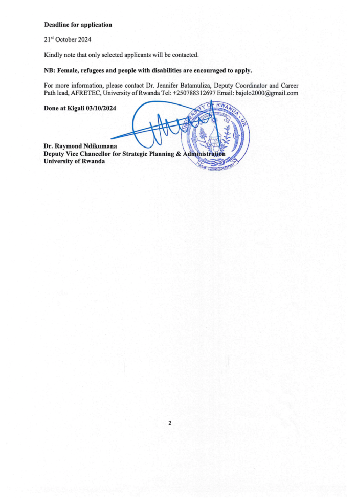 HomeSCHOLARSHIP SCHOLARSHIP The call for application for Certification Short Courses supported by AFRETEC base funding Project: (Deadline 21 October 2024) By CEO October 15, 2024 0 219 FacebookTwitterPinterestWhatsApp The call for application for Certification Short Courses supported by AFRETEC base funding Project: (Deadline 21 October 2024) Share FacebookTwitterPinterestWhatsApp Previous articlePolisi irasaba abagenzi kugira uruhare mu kwirinda impanuka zo mu muhandaNext article37 Job Positions at Rwanda agriculture and animal Resources Development Board (RAB): (Deadline 15 October 2024) CEO Related Articles Uncategorized REB Accountability measures for non-compliance with mandatory English proficiency training NESA PAST PAPERS Rwanda S1, S2 and S3 Term 2 District Past Papers Uncategorized Master the CBC: Rwanda Primary 1–6 Term 2 District Past Papers LEAVE A REPLY Cancel reply Comment: Please enter your comment! Name:* Please enter your name here Email:* You have entered an incorrect email address! Please enter your email address here Website: Save my name, email, and website in this browser for the next time I comment. Stay Connected0FansLike0FollowersFollow0SubscribersSubscribe Latest Articles Uncategorized REB Accountability measures for non-compliance with mandatory English proficiency training NESA PAST PAPERS Rwanda S1, S2 and S3 Term 2 District Past Papers Uncategorized Master the CBC: Rwanda Primary 1–6 Term 2 District Past Papers EDUCATION REB Urutonde rw’Abayobozi b’amashuri n’abayobozi bungirije bagirwa inama yo kujya mu kiruhuko cy’izabukuru. EDUCATION REB (All Districts) List of DOS, DOD and HeadTeachers reassigned to teaching positions and placed school Load more