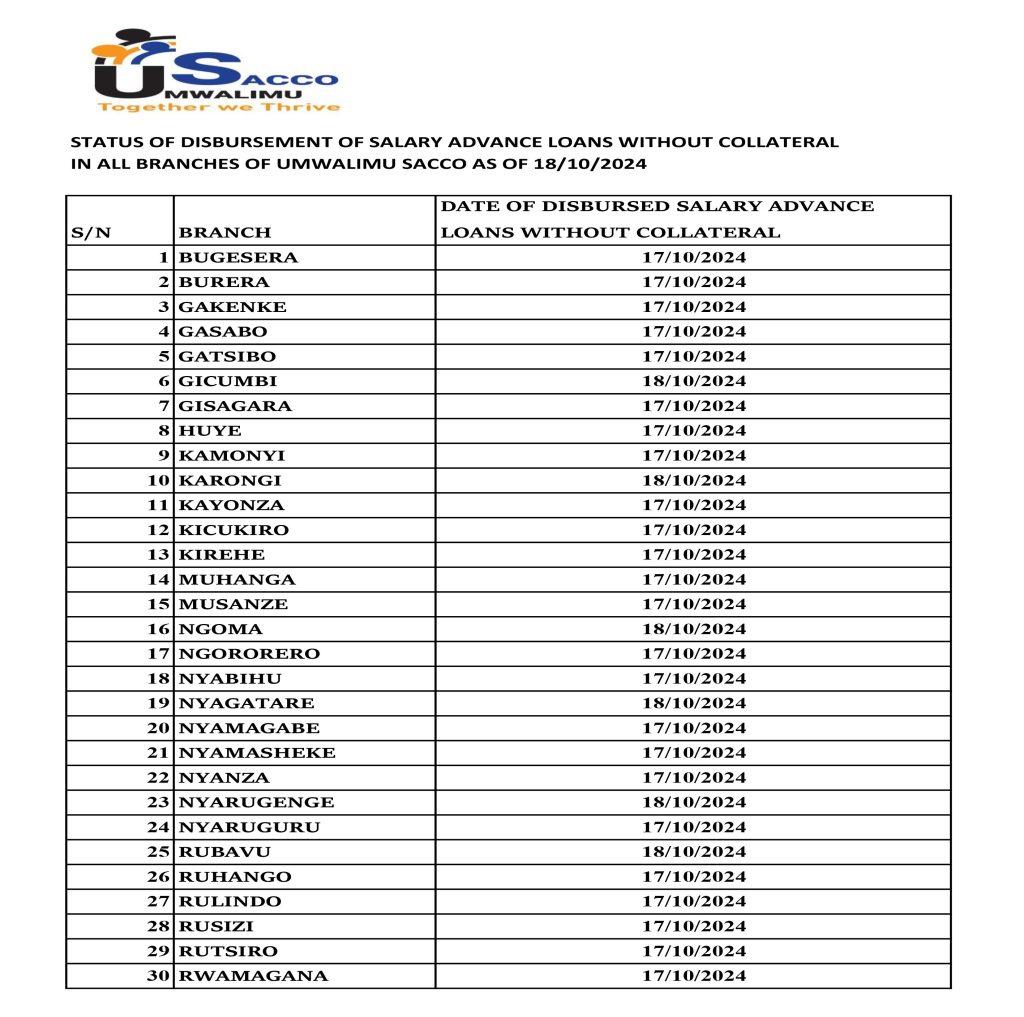 @umwalimusacco (Status of Disbursement of Salary Advance Loan without collateral in all USACCO branches as of 18/10/2024).