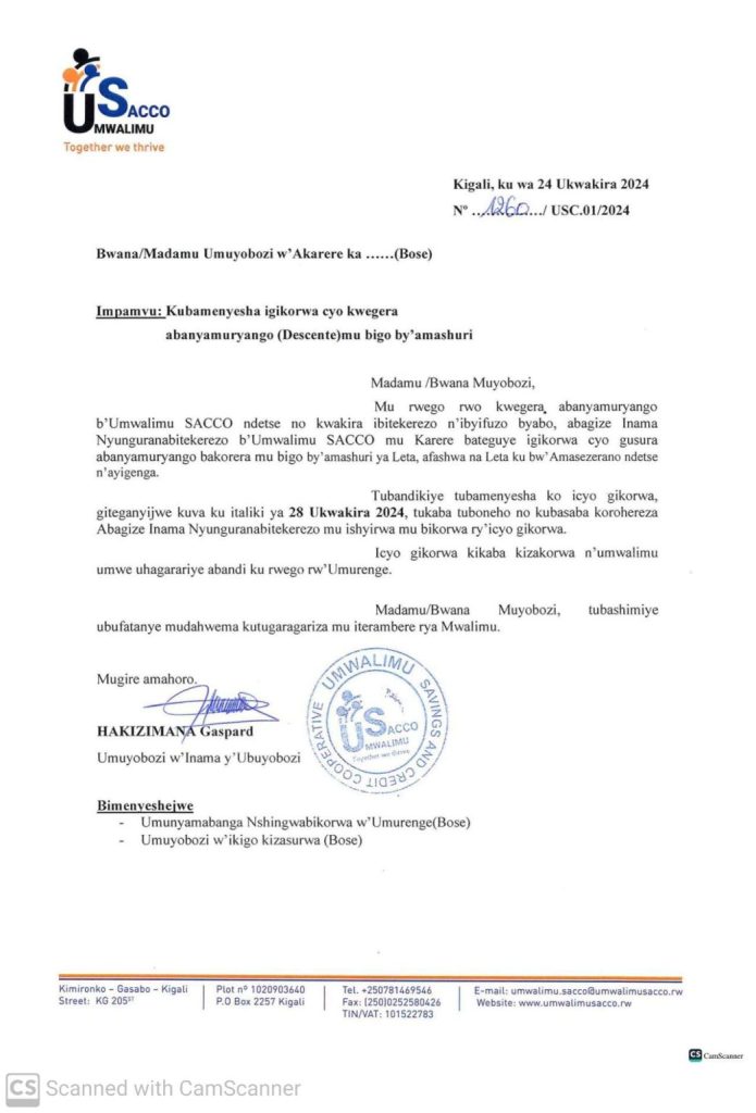 HomeUncategorized Uncategorized U-SACCO Itangazo rigenewe Abarimu n’abanyamuryango bayo bose. By CEO October 28, 2024 0 212 FacebookTwitterPinterestWhatsApp Itangazo rigenewe Abarimu n’abanyamuryango bayo bose. Share FacebookTwitterPinterestWhatsApp Previous articleUbuhamya bw’umuganga wakize indwara ya MarburgNext articleREB/MIFOTRA TEACHING JOB EXAMINATIONS PAST PAPERS FOR DIFFERENT SUBJECTS. CEO Related Articles Uncategorized REB Accountability measures for non-compliance with mandatory English proficiency training NESA PAST PAPERS Rwanda S1, S2 and S3 Term 2 District Past Papers Uncategorized Master the CBC: Rwanda Primary 1–6 Term 2 District Past Papers LEAVE A REPLY Cancel reply Comment: Please enter your comment! Name:* Please enter your name here Email:* You have entered an incorrect email address! Please enter your email address here Website: Save my name, email, and website in this browser for the next time I comment. Stay Connected0FansLike0FollowersFollow0SubscribersSubscribe Latest Articles Uncategorized REB Accountability measures for non-compliance with mandatory English proficiency training NESA PAST PAPERS Rwanda S1, S2 and S3 Term 2 District Past Papers Uncategorized Master the CBC: Rwanda Primary 1–6 Term 2 District Past Papers EDUCATION REB Urutonde rw’Abayobozi b’amashuri n’abayobozi bungirije bagirwa inama yo kujya mu kiruhuko cy’izabukuru. EDUCATION REB (All Districts) List of DOS, DOD and HeadTeachers reassigned to teaching positions and placed school Load more
