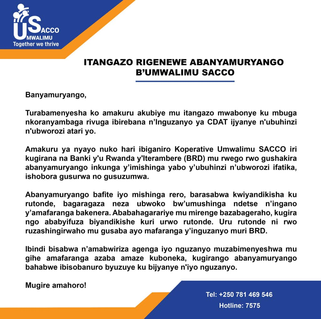 Koperative Umwalimu SACCO yongeye kwizeza abanyamuryango bayo ko ihora ishakisha amahirwe yateza imbere imibereho yabo, cyane cyane mu bijyanye n’imishinga ibyara inyungu ibafasha kwiteza imbere no kugira ubuzima bwiza. Ibi byagarutsweho nyuma y’uko ku mbuga nkoranyambaga hakwirakwiye amakuru y’ibihuha yavugaga ko hari inguzanyo nshya za CDAT zatangiye gutangwa ku mishinga y’ubuhinzi n’ubworozi. Ubuyobozi bw’Umwalimu SACCO bwashimangiye ko ayo makuru atari yo, ariko bunemeza ko koko hari gahunda nshya iri gutegurwa ku bufatanye na Banki y’u Rwanda y’Iterambere (BRD), igamije gushakira abanyamuryango inkunga y’ishoramari mu buhinzi n’ubworozi.